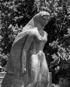 Bu kez çok daha hareketli, neredeyse canlı bir heykel karşısındayız. Koruyucusu olduğu kişinin mezarına şevkatle sarılmış; yumuşaklığıyla, sıcaklığıyla onu hayata döndürecek neredeyse; ama gözleri yine toprağa bakıyor, bir tür onun ölümünü kabullenmişlik içinde; duru, yalın, huzurlu bir keder var ifadesinde, öylesine; sevgisini ölümsüzleştiriyor.