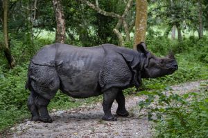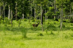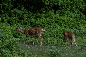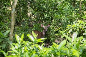 Kıyılarda çeşitli kuşlar, geyik, bambiler görünüyor. Bambi ismi gerçekten var mı yoksa çizgi filmden mi kaldı akıllarda bilmem ama buradaki insanlar da bambi diyor o küçük beyaz lekeli ceylana. Yine su içen bir gergedana rastlıyoruz. Bu sefer kayıkla iyice yaklaşıp fotoğraf çekebiliyoruz. O da bizi seyrediyor sonra sıkılıp gidiyor. Suda epey gittikten sonra kıyıya çıkıyoruz. Geriye orman içerisinden yürüyerek döneceğiz. Rehber var olan, karşımıza çıkabilecek hayvanları sayıyor; kaplan, ayı, piton, geyik, fil, gergedan…… Neyse, rehber bugüne kadar sağ kalıp yaşadıysa bize bir şey olma ihtimali az diye teselli bularak ilerliyoruz. Kaplan falan değil ama bol ve çeşitli kuş, bambi ve böcekler görerek ilerliyoruz.