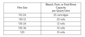 Geliştiricinin kimyasal etkinliği filmlerin yüzey alanlarına göre belirlenmektedir. Üreticiler bu bilgilerden hareket ederek kullanıcıya yol göstermektedir. Bununla ilgili en doğru bilgiler C41 üreticisinin verdiği kullanma kitabında yer almaktadır. Yine Tetenal’i referans alarak şu tabloyu vermek mümkündür: