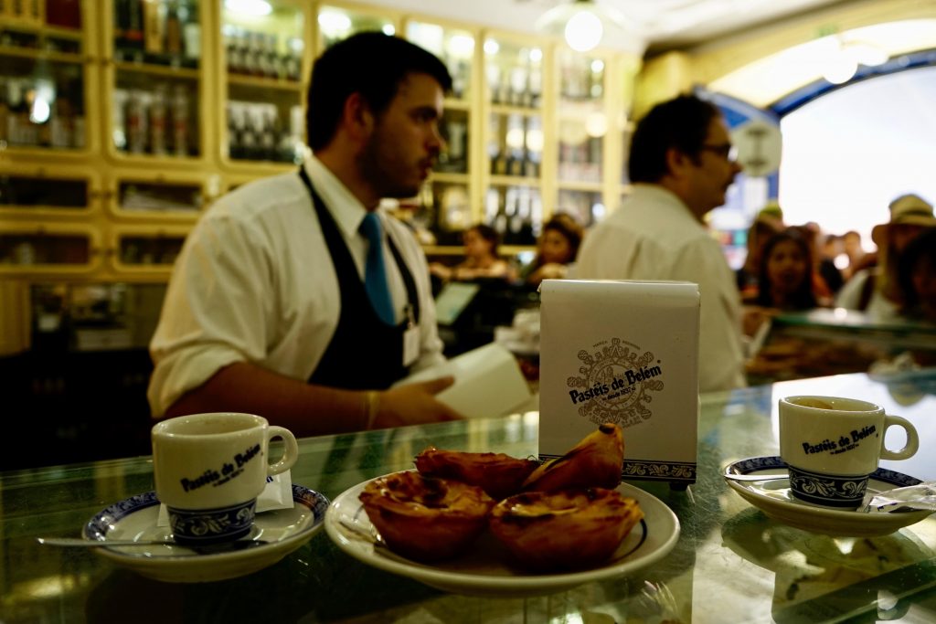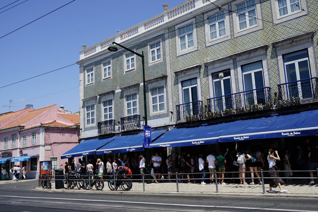 Belem deyince akla ilk önce Belem turtası geliyor. Lizbon’da hemen tüm pastanelerde bulabileceğiniz Pastel da Nata veya daha çok bilinen adıyla Pasteis de Belem’in doğduğu yer burası. Hikaye şöyle; Belem Katedrali‘ndeki keşişlerden biri elinde çok fazla yumurta kalınca bunlarla ana maddesi yumurta ile şeker olan ufak turtalar yapmış ve bunları satmış. Çok beğenilen turtalarını yapmak için zamanla bir pastaneye ihtiyaç duymuş, işte bu ilk pastane halen çalışır halde. Pastanenin içerisi de turtalar kadar güzel, duvarlar mavi desenli fayanslarla kaplanmış. Özellikle hafta sonları önünde uzun kuyruklar olan pastaneye daha az sıra beklemek için pazartesi gittik ama bu sefer de kapalı olan katedrali gezemedik.